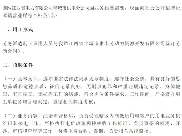 國(guó)網(wǎng)江西省電力有限公司豐城市供電分公司因業(yè)務(wù)拓展需要,現(xiàn)面向社會(huì)公開招聘段潭鎮(zhèn)營(yíng)業(yè)廳綜合柜員1名:一、用工形式勞務(wù)派遣制(錄用人員與我司江西省豐城市惠豐勞動(dòng)力資源開發(fā)有限公司簽訂勞動(dòng)合同)。二、招聘條件(一)基本條件:遵守國(guó)家法律法規(guī)和規(guī)章制度,遵守社會(huì)公德,...